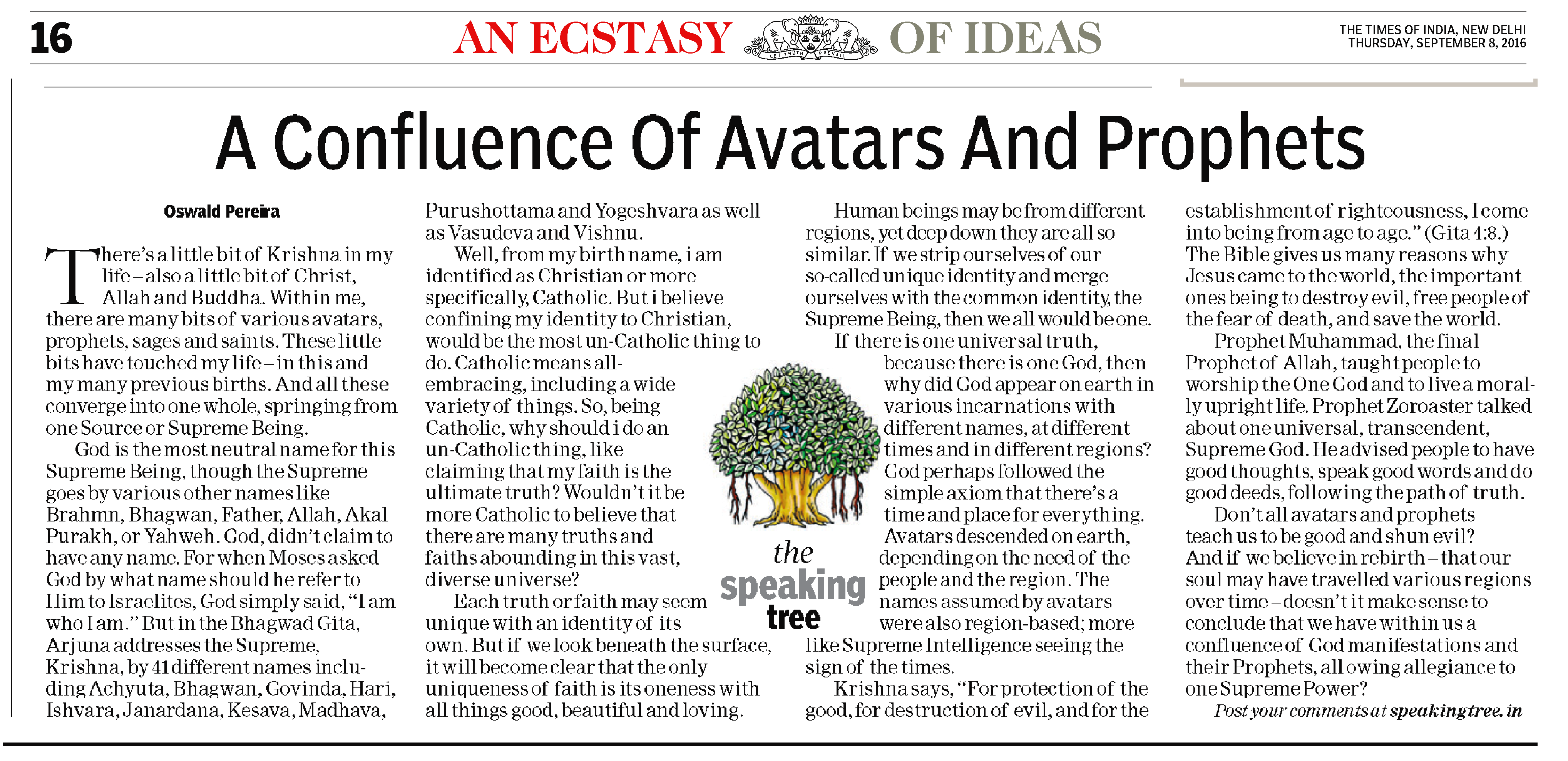 Oswald Pereira’s article titled, A Confluence Of Avatars And Prophets in The Times of India edit page